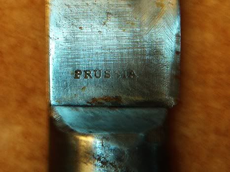 #4 Old butcher marked Prussia, pewter bolster, initials carved into handle, see pics, $30.00 shipped