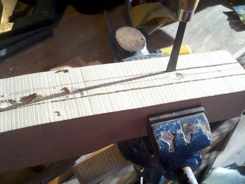 Here is the beginning. I scribed the center and marked out the channel and I am simply outlining the outer scribes with a flat chisel to keep the cuts from going to far beyond my intended area...