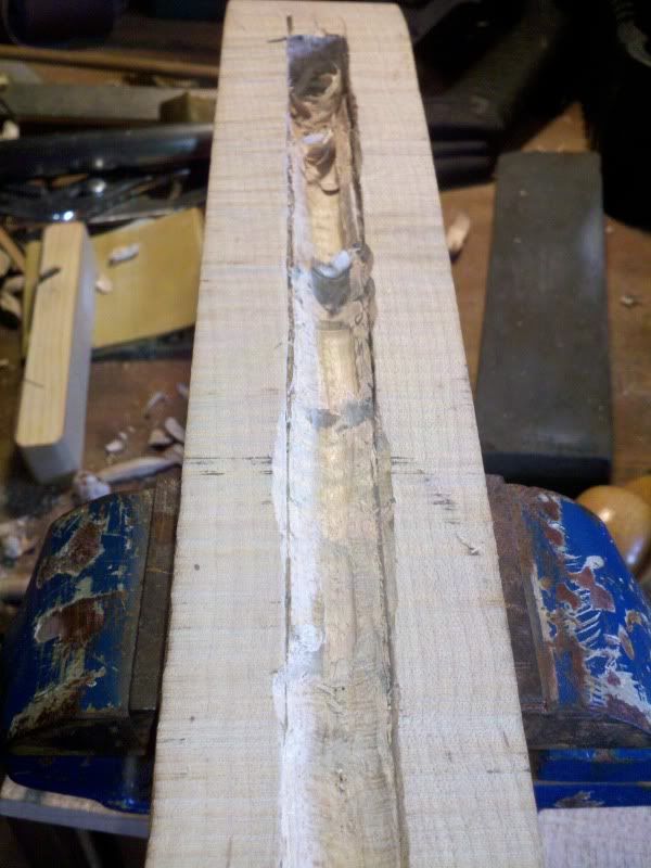 What you should do before going further is lay out where everything goes on the blank . I put a layout plan in this forum . After laying out parts placement you need to cut away the top portion of wood from breech to muzzle half the width of barrel dimention . For hogging out bulk of wood , a set of Stanley chisels from hardware store or WalMart polished up with very fine sand paper and stones will make removel of the wood quick.