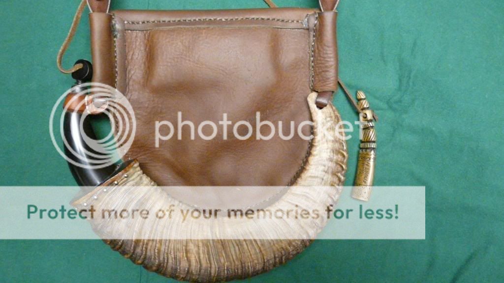 Another one of my "of the wall horns. Some kind of sheep horn from Hawaii or so I was told by the man who donated it to the shoot where I won it. I couldn't put a spout on the other end, it was flat and solid so I pluged the large in and made a spout made  from Buffalo horn then made a pouch that slides up and down on the horn straps. A little different but hangs nice and flat against my side. I use it with a .54 ML pistol.