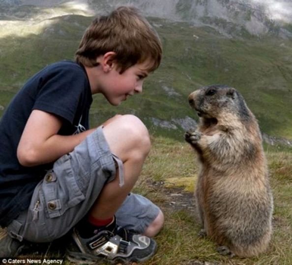 Nose to nose: A marmot greets eight-year-old Matteo on the slopes of the  Austrian Alps.