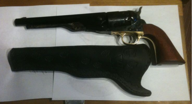 I set up lastnight watching westerns an made me a LH Cross Draw slimjim holster for my Pietta 1860 Army, Stained with vinegaroon, Tandy leather had some 6/7 ounce leather rectangles for $20, just enough to make two holster out of, not bad for a first holster, I like it an it definitely will work, Now to make one for my brass framed one.