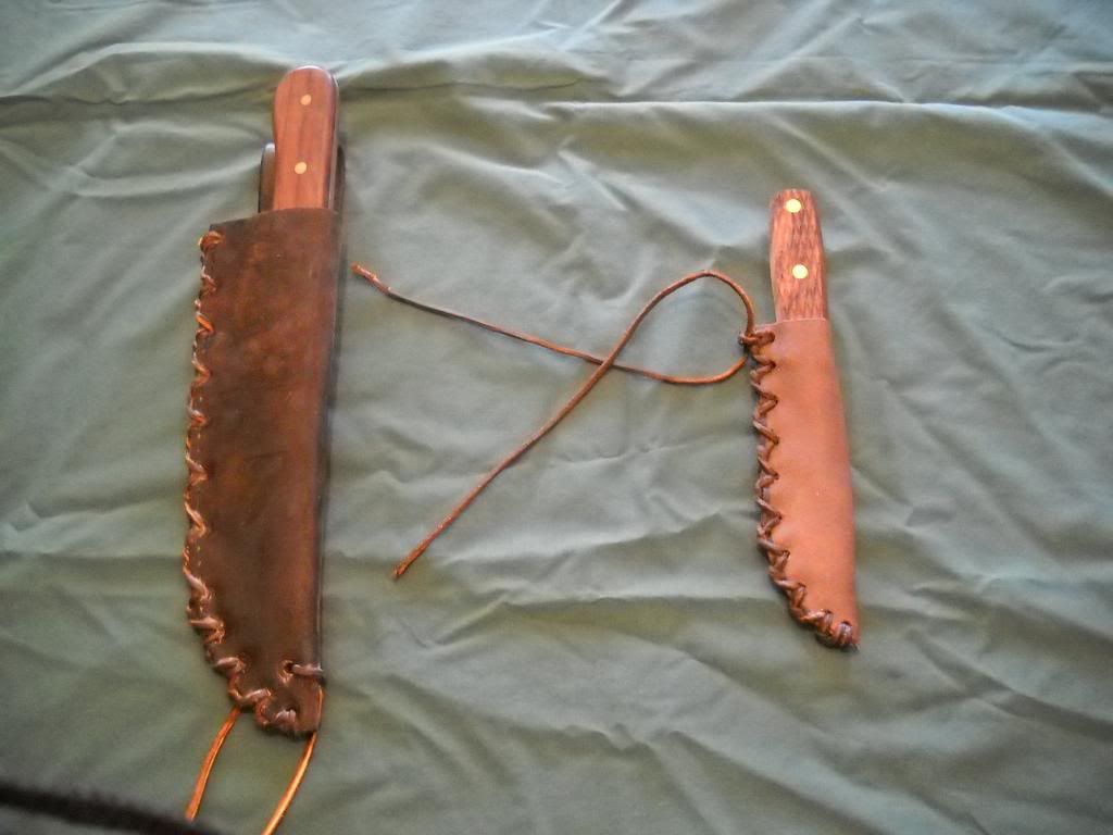 Did you put gussets into the sheaths to protect your lacing from the blades? Also, you can leave one side of your unstitched, unfolded pattern longer and then fold it over and stitch it to what will be the backside of the sheath. This will give you an integral belt loop. Sometimes these knives were thrust through a belt with either a built in hook or a short lanyard used to secure it to the belt.