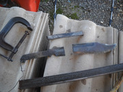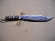 After deciding that my "Big Bowie" project was not going to work as hoped, I took the remaining two blanks and cut 2" off the length and recut the tip profile. This made a more balanced looking blade. Lot's of grinding later I had a decent, still slightly convex cutting edge good overall look. Made brass guards and drilled a few holes in the handle. Made wood scales for one and gave it to my Bowie buddy so he could work the wood down to where he wanted it. Mine, I made up my usual leather and hemp cord handle and was ready to harden it back to it's 5160 spring steel self. Fired up the forge (yes I got it to work, thank you shop vac) and heated it up once and quenched it.   dntn    Boom, just like Beowulf said, went back to it's original leaf spring curve.   pnic   No problem my impulsive, get it done self said, I'll just clamp it flat and heat it up again. So clamping it between a length of angle iron and a smaller piece of straight steel I heated it all up red hot and plunged it it into the water. In amongst the boiling water sounds came a sharp crack.   :-&   I knew without looking what happened.   :'(    So with tears in my eyes over the (too many to count) hours I had into it, I unclamped it and it fell to the ground in two pieces.