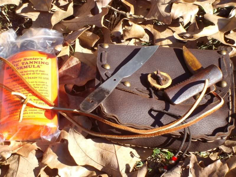 In a post I was asking about tanning a beaver hide or 10 and he sent me a PM that he would be sending me some tanning fluid he had used. Well fellows the box came today and what a surprise; along with the fluid was another bag that fits my belt just right, a brand new Russel patch knife blade, and I think it's a skweril attractor.
