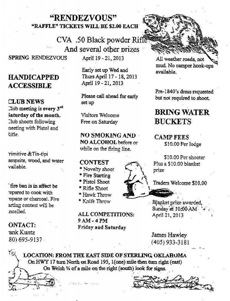 Our spring Rondy is coming up in April, here's the flyer. Good time, very laid back group of folks, proper pre-1840s dress encouraged but not required. The location is out in the country just north of Sterling Okla. on private 80 acres wooded area, plenty of camping space.