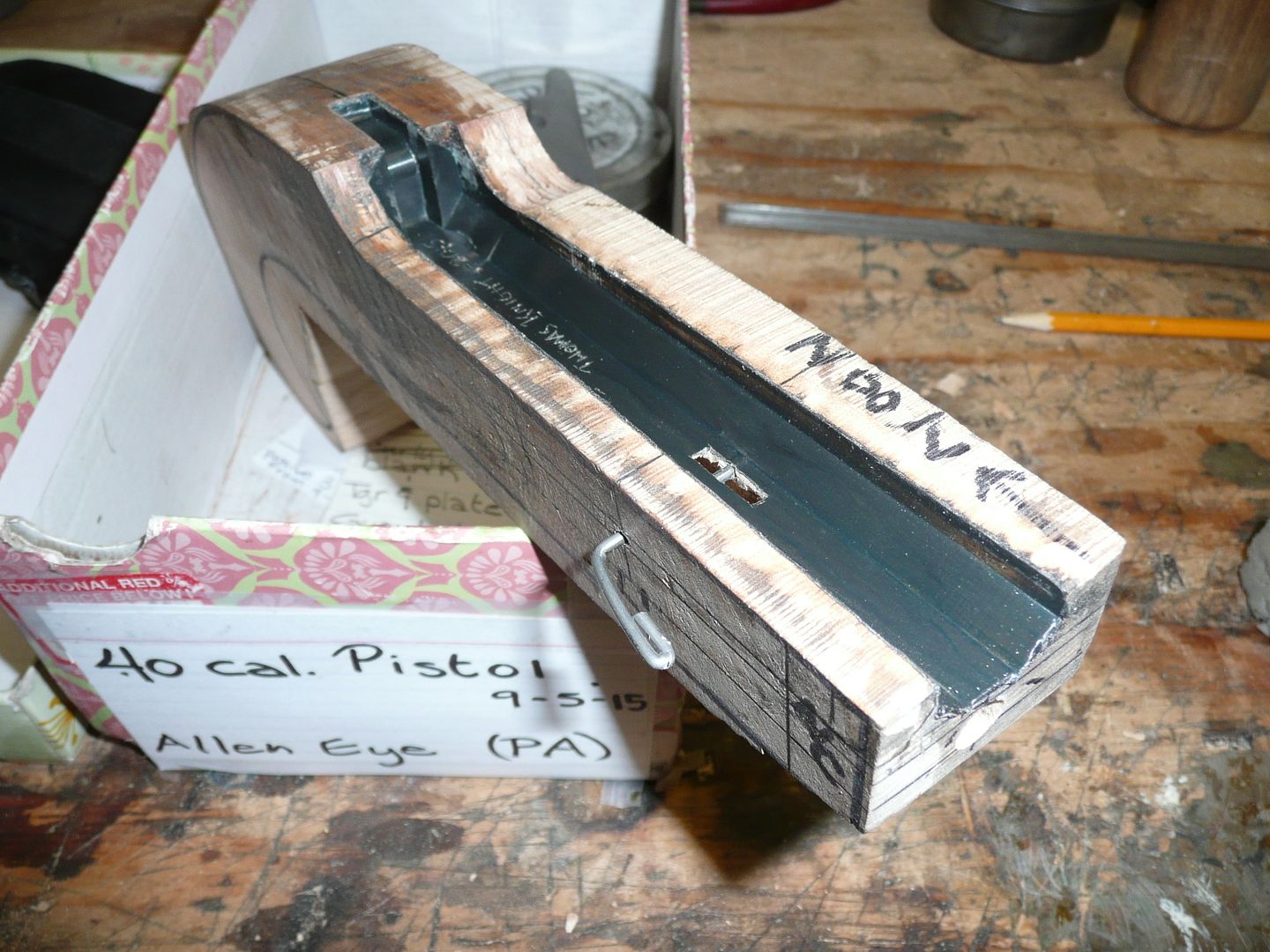 Hello all,  Been whittling on a .40 cal. 1/2 stock pistol of late.  Here she is in mostly final stages, some metal polishing to do up.