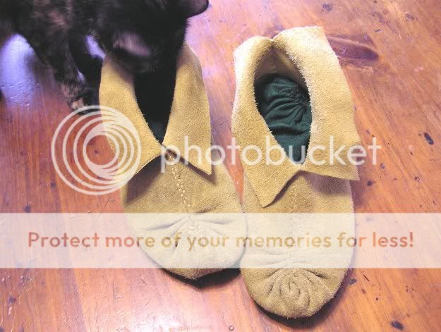 Finished my first pair of mocs today. Used the Michael Galban video as a guide. Made of moose hide from Two Bears Trading. Probably would have been easier with some lighter weight leather, but I finally finished with minimum blood loss. Glovers needles don't forgive.