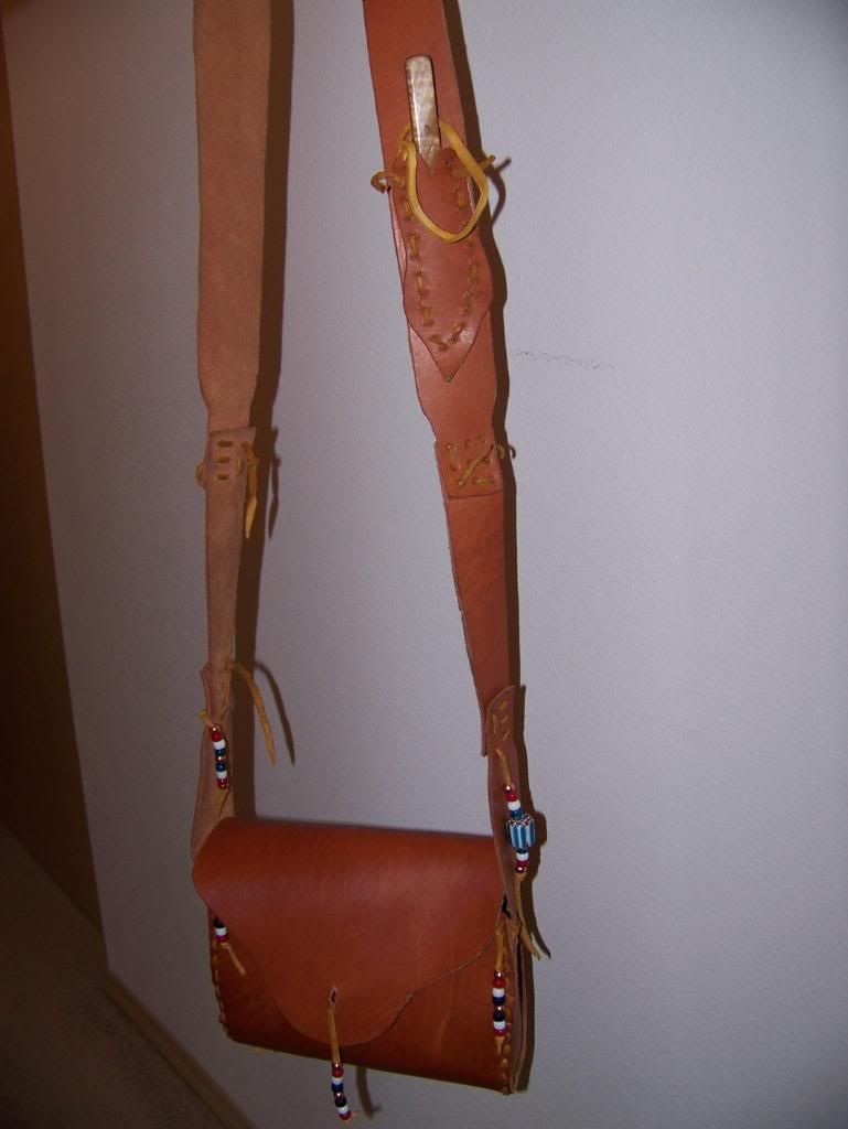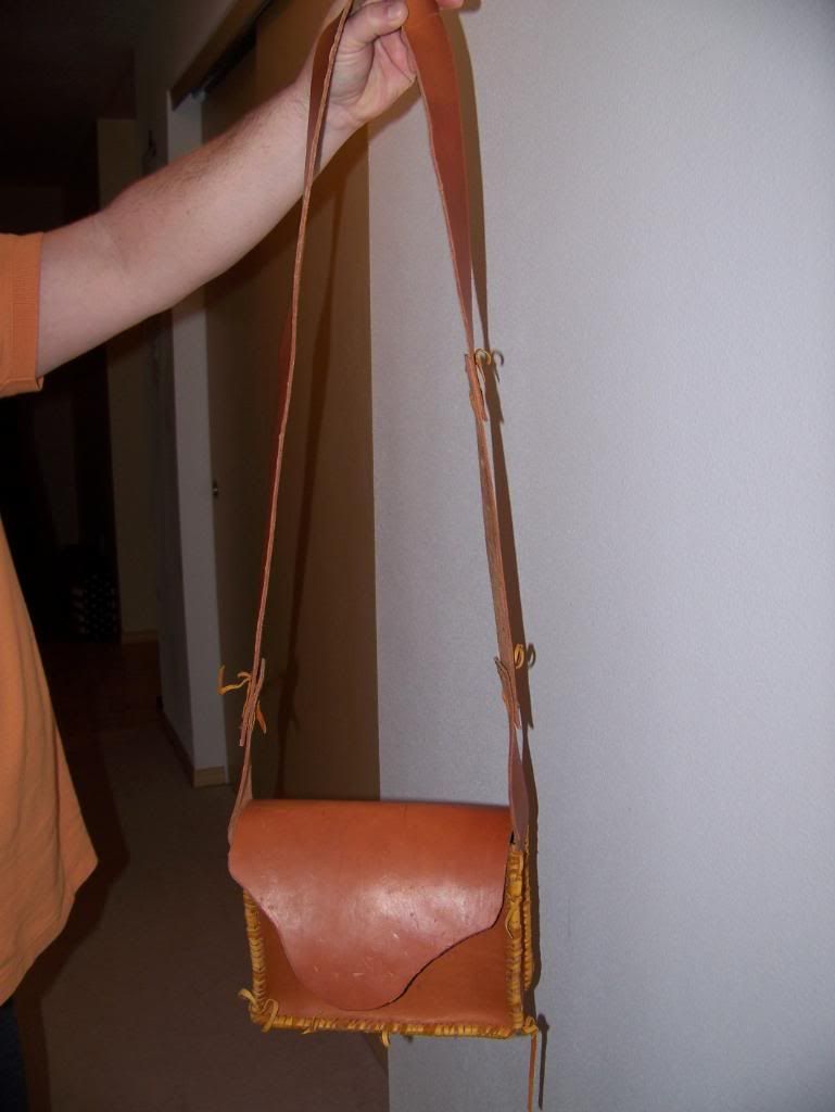here are a couple possible's bags i made for my wife and myself. both 9" x 8". strapes 2" wide. used cow leather. used vegie oil for color. just starting to make some items.. this is my wife's. this one's mine flwa