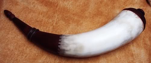 Well, it's been quite awhile since I've been able to get to the bench and get a horn made, last year it was working from spring until late fall and living on the job site, which time my daughter moved in in Sept and the shop became Dads' storage facility!!!!!!!!!!!! This last weekend while I was at the West Coast Horn Fair she moved out on Friday and I have been able to get through the shop from one end to the other, came home from the WCHF late Sat night, cleaned the shop on Sunday and half the day yesterday to be able to find all my stuff not to mention the top of the bench!, with the juices running from all the cool stuff over the weekend I just had to get out there and make some dust and see if I could still make an acceptable horn, this is what the finished outcome was, gotta get back out there, have a couple more cut and drilled and screaming to be abused! This one was made for our friend The Weaving Welshman, dyed to match that new rock lock rifle of his!