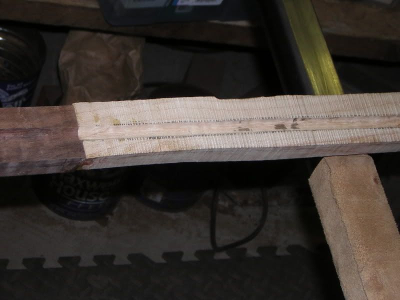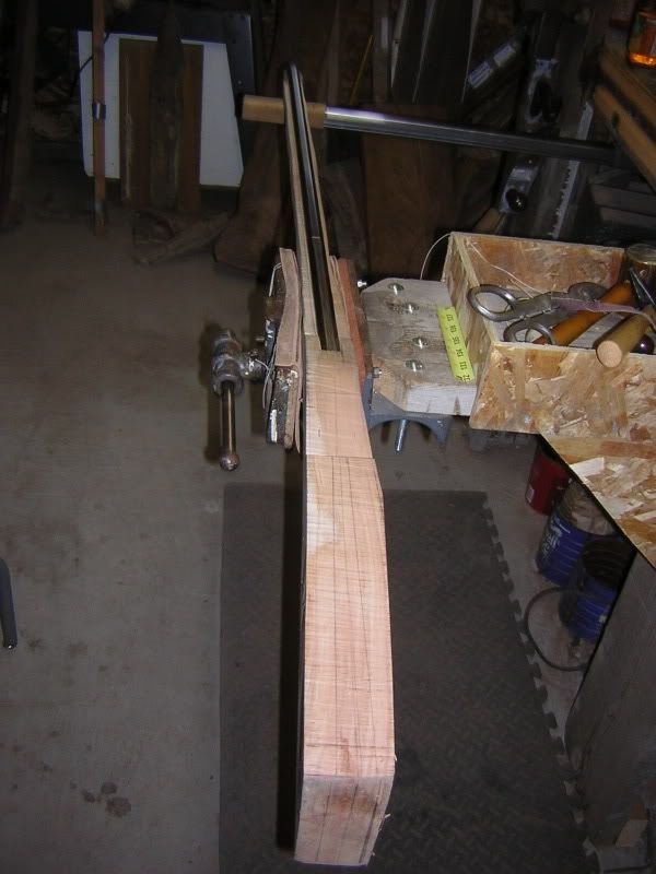 The forestock petered out and was too thin because of the 'wow' the duplicator made and I had to cut the stock back and add a hunk so I used a hunk of walnut for grins. When I pull the barrel out I'm going to cut some grooves inside the channel on the 45deg flats that overlap the walnut and maple to epoxy in some threaded screw stock for strength on the tip.