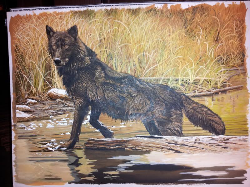 By starting #4 I sort of committed to a serious of 6 wolf painting. This one I started yesterday just before the game started. Basic outline and color pallet are down. I hope you enjoy the painting of the Black GIANT 's