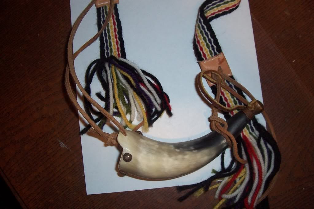 OK boys, I'm in a quandary and could use a little direction.  I'm looking for a strap for my powder horn and see there are lots of choices.  I see leather straps, leather thongs, woven straps with leather findings and D-rings &, etc.  I'm inclined to go with an 1 1/4" (or thereabouts) inkle loom strap and use the 7 or 8 inch loose strands at the ends to tie to the horn.  I don't believe the woven straps with leather ends (think suspender straps) are correct, but I could be wrong.  Does anyone have any insights they could share?