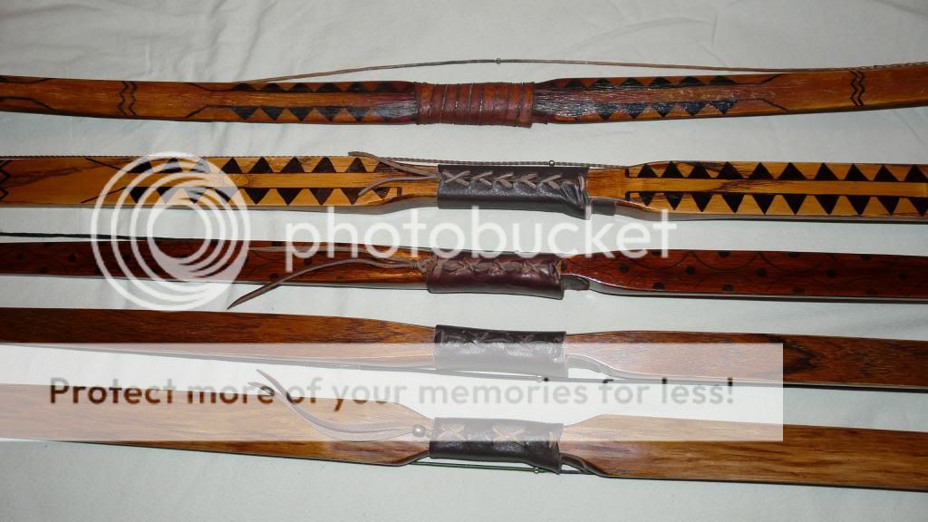 Here's 5 self bows that I've made or at least the middle of them. The top one is sinew backed Oak and the design is copied from a Modoc Indian bow. the 2nd is Ash, the 3rd and 4th are Hickory backed Elm and the 5th is Hickory. All shoot good but the 3rd or middle one  I shoot best and have won a bunch of shoots with it.  There's a set of 3 books called the Bowyers Bible that will tell you everything you ever wanted to know about making bows.
