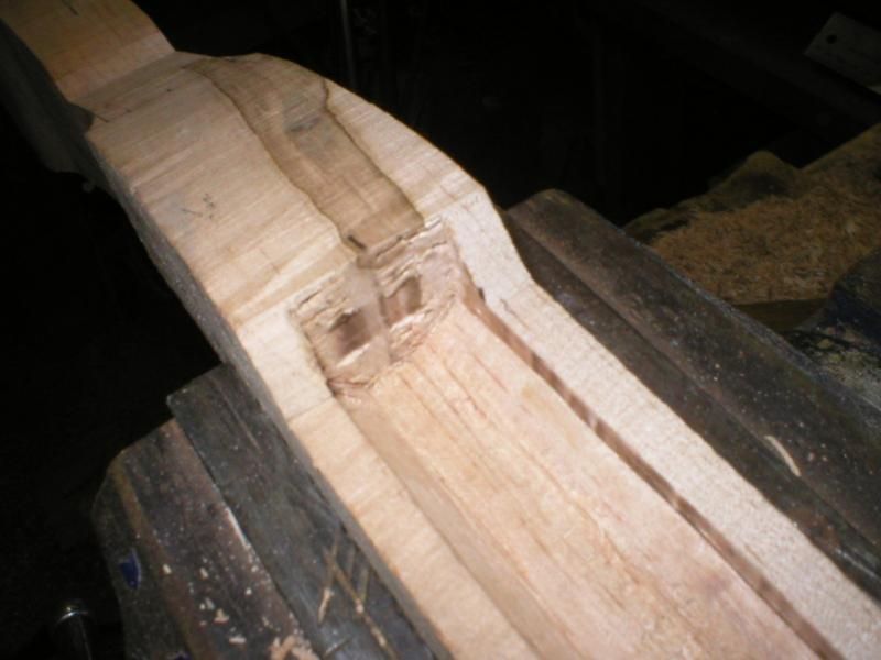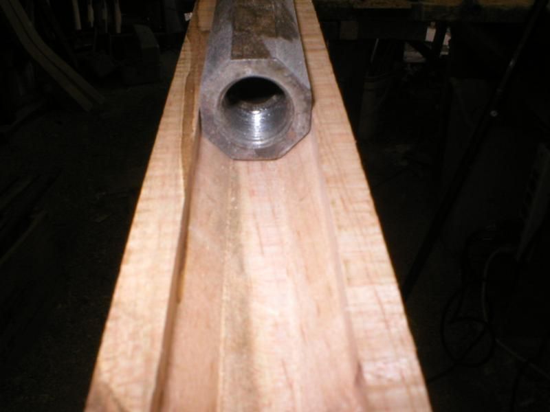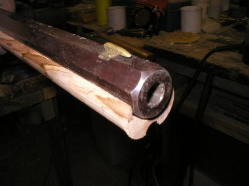 These next several photos show the barrel channel taken as far as the router can go, being finished with chisels, and finally the end result -- a nice, square breech section and a barrel nestled happily in its new home.