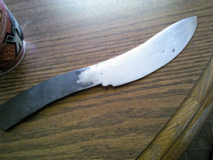 Now I have tempered this knife.  I heated in my forge to bright orange then quenched in cooking oil. I tempered in the oven at 425 for an hour.  I followed with heating the spine on the electric stove burner to a dark blue with the edge at a  dark medium straw color. It needs handle material.