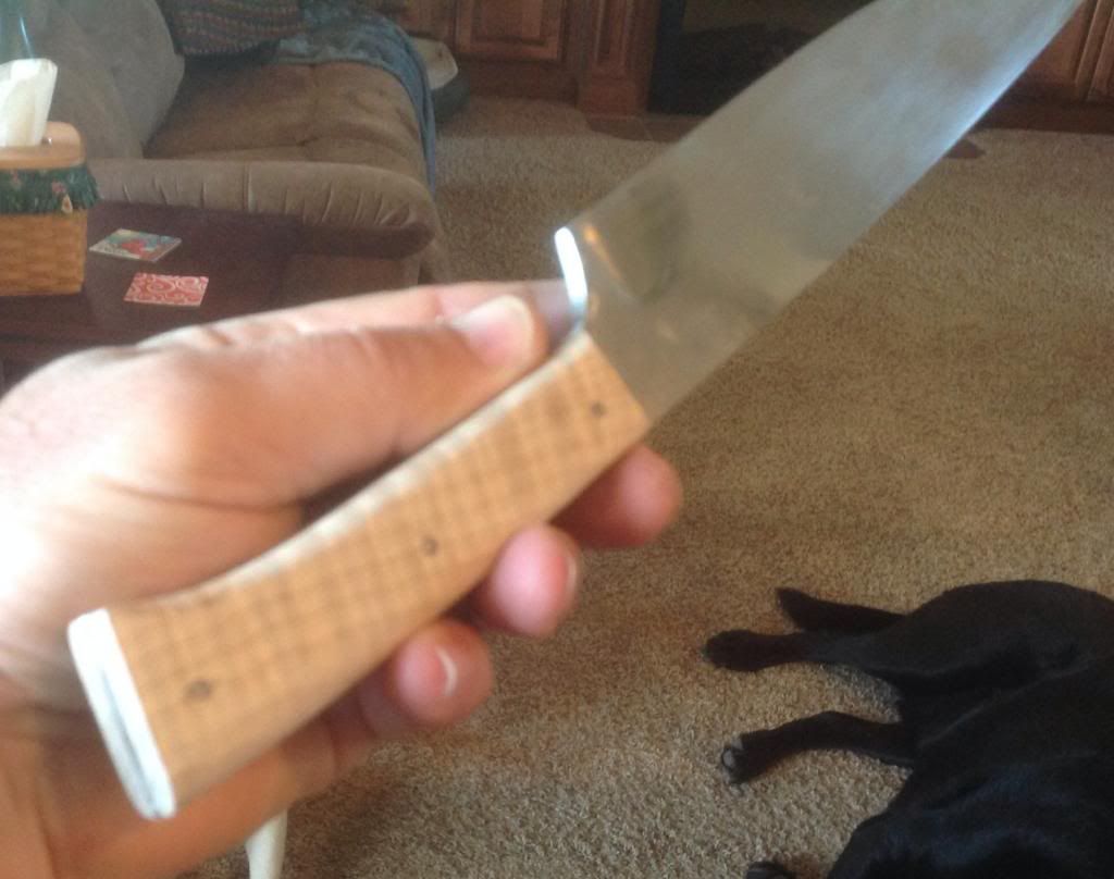 A couple of months ago I contacted Wick Ellerbe about getting one of his French Boucheron trade knifes, but he emailed an said he wasn't taking any new orders. Soooo! Ordered me a carbon steel blank an some curly maple slabs a decided to make my own, starting to take shape, need to finish shaping the handles then skinny the blade up some more an I'll be there, not an exact duplicate of wicks but I'm liking it, last year I used the same carbon steel blank to make me a ball handled knife like Wick makes also.