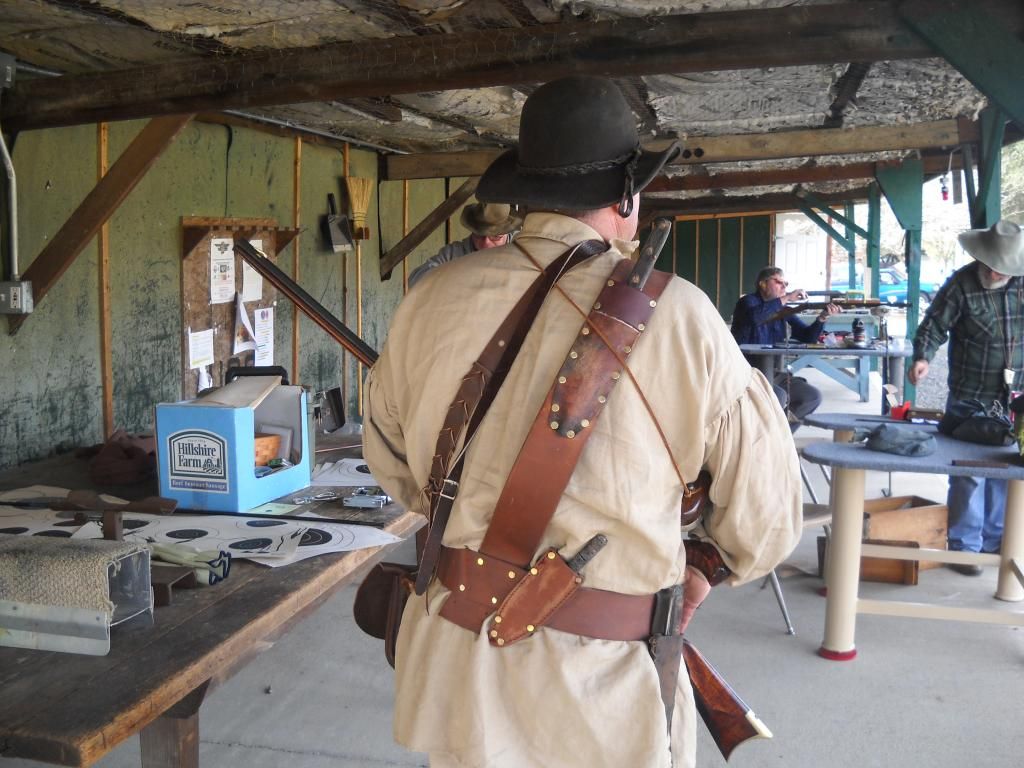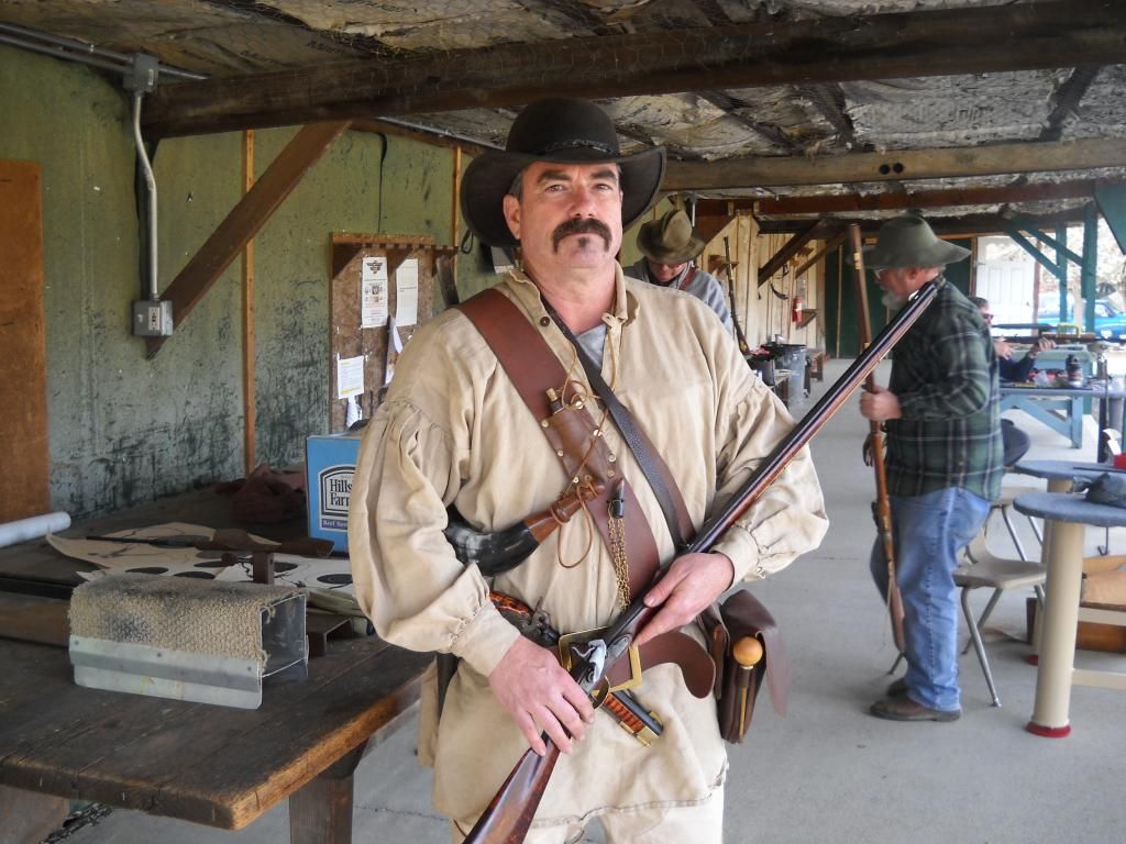 Yawn... Stretch... Yeah, it's been a bit lazy and slow here on Ye Olde Parsimonious Front Stuffing Smoke Pole Discharger Cyber Gathering Place, so rather than just give in to relaxing and watching football I made the perilous trek up North and joined in with the fuzzy hat guys in making some smoke and fire while putting holes in pieces of paper about 50 yards out. Today was different than most as we did not have a competition but rather spent over 4 hours sighting in and passing advice back and forth. The advice most of the guys gave me was to find a hobby where the outcome was not dependent on my aim. Go figure. Although my shooting skills were less than spectacular, I did show up in all my 1805 regalia which did shock the group. It shocked the guy that borrowed one of my throwing knives a couple of months ago so bad that instead of giving it back to me with a critique, he appropriated it for his personal collection and said he was doing it for my own good. It's a good thing that I am surrounded by friendly folk that are always looking out for my welfare. I didn't even think of bringing a camera with me today (Hey, remember I never claimed to be smart) but one of the guys did and he emailed me a couple of pictures of me in my getup, so reluctantly I am sharing the pics with the ever so gracious members of this here forum.