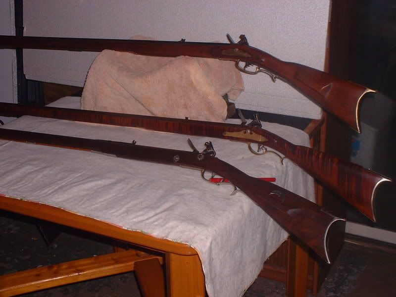 Here are 3 longrifle's that I built with original wrought iron barrels. They are all small bores, two 32 caliber and one a 29 caliber.  Sold two of em and kept one of the 32's for myself.   I find that my fascination with flintlocks must come from some cloudy corner of my left brain. I can never seem to just get over all of the fun it is to make a rifle go boom from a sparking rock lock!