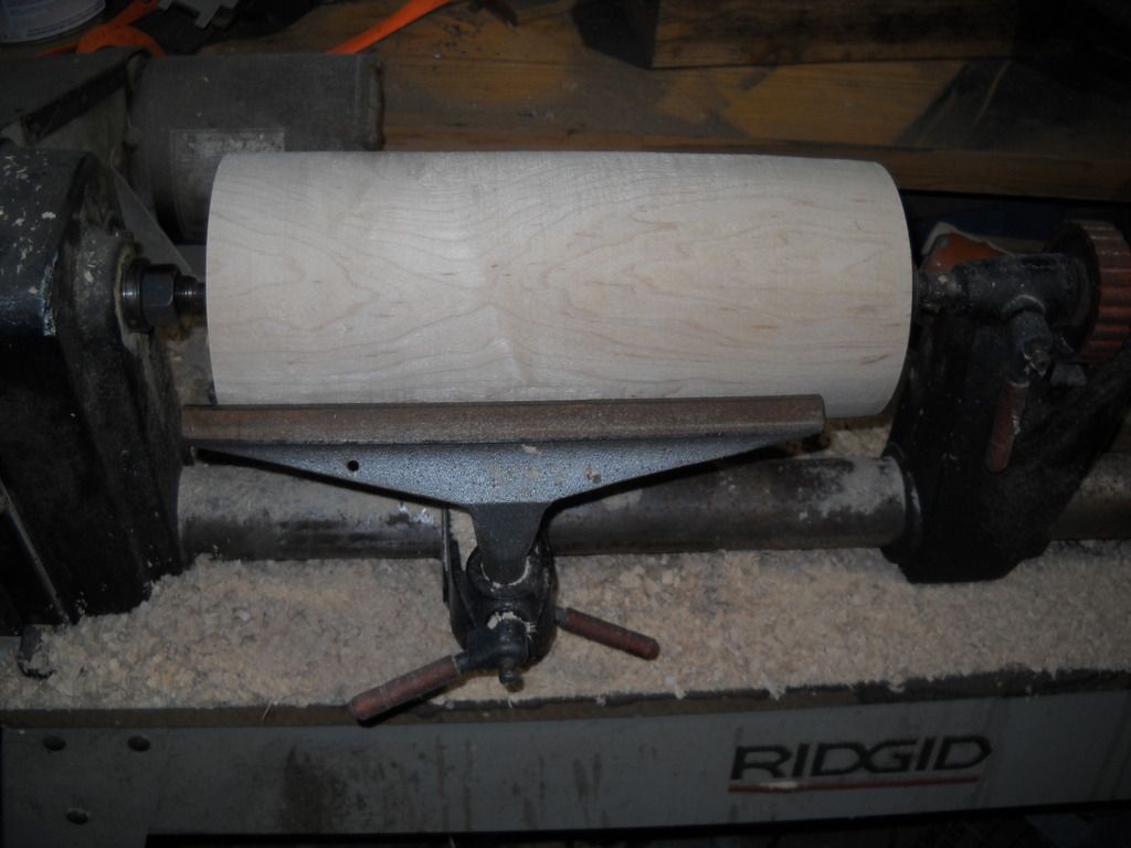 There is a lot of decision making and figuring going into this. I don't have any dimensioned drawings to go off of, I had to extrapolate sizes going from overall full scale and making my own drawings, or more correctly, a list of measurements at several points on the cannon and will have to do the same for the carriage. The first thing to be made is the hubs for the wheels. Had plenty of Northern Hard Maple left over from cutting the stock out for my long ignored 1780 flintlock project so they were glued together, cut to size and now a block of maple is sitting in the lathe waiting to become a matched pair of hubs. Already have the retention rings by cutting them out of some leftover pieces of 5" and 3" pipe.
