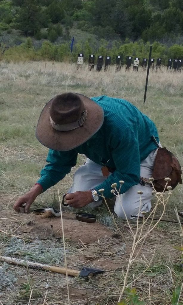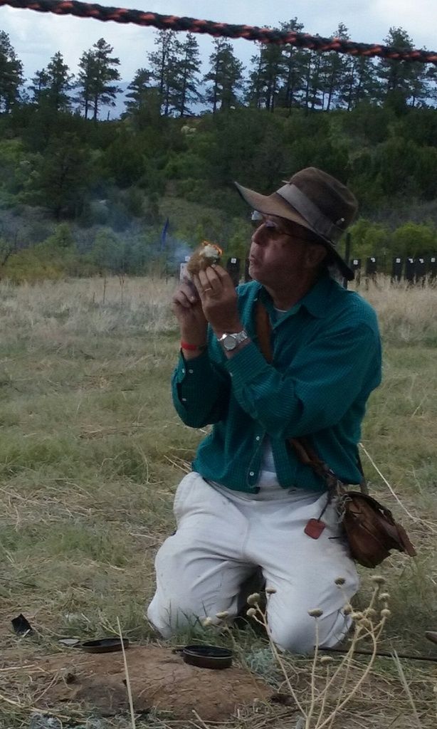 For those who don't believe you can really start fires with flint & steel, here is proof positive. I am posting these pictures for Flintboomer at his request. This is him making fire at during the mountain man run Memorial day weekend, Florence Colorado