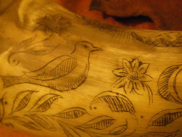 well folks I never did get an answer from my friend who did this work, what I decided is I couldn't afford to pay him what it is worth to me! So the best thing I can do is show off his work and tell you how to contact him if you like it and want him to do something for you. here is his first attempt at a "Simple" scrimshaw.please pardon my bad pictures.