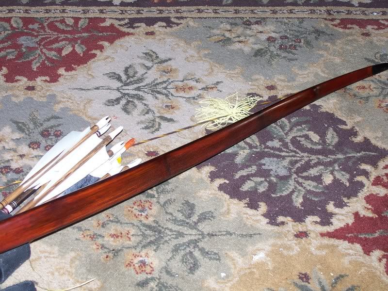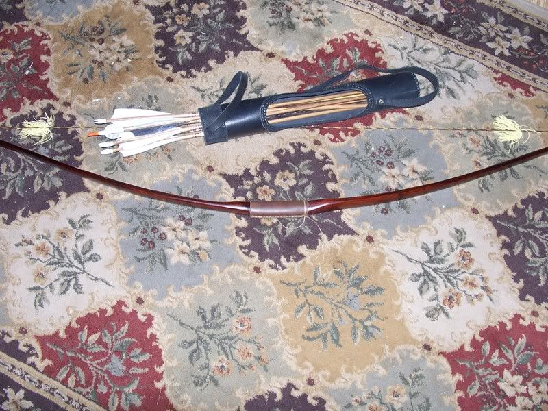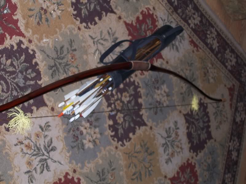 this is my bow it is a 68" bamboo backed hickory and pulls 55lb@28" my quiver is a slide through  for easy arrow removal if sitting   the next bow is my son's war bow this is a monster it pulls 145lbs @30" and is 7ft.long made from cedar and will cast a a heavy arrow in the 5-600 gr. range 200-300yards quit easy  this would have been what you faced  in the 1400 's a 1000 archers casting arrows as fast as possible out to 400yards the sky would have  been  black with  arrows  coming down