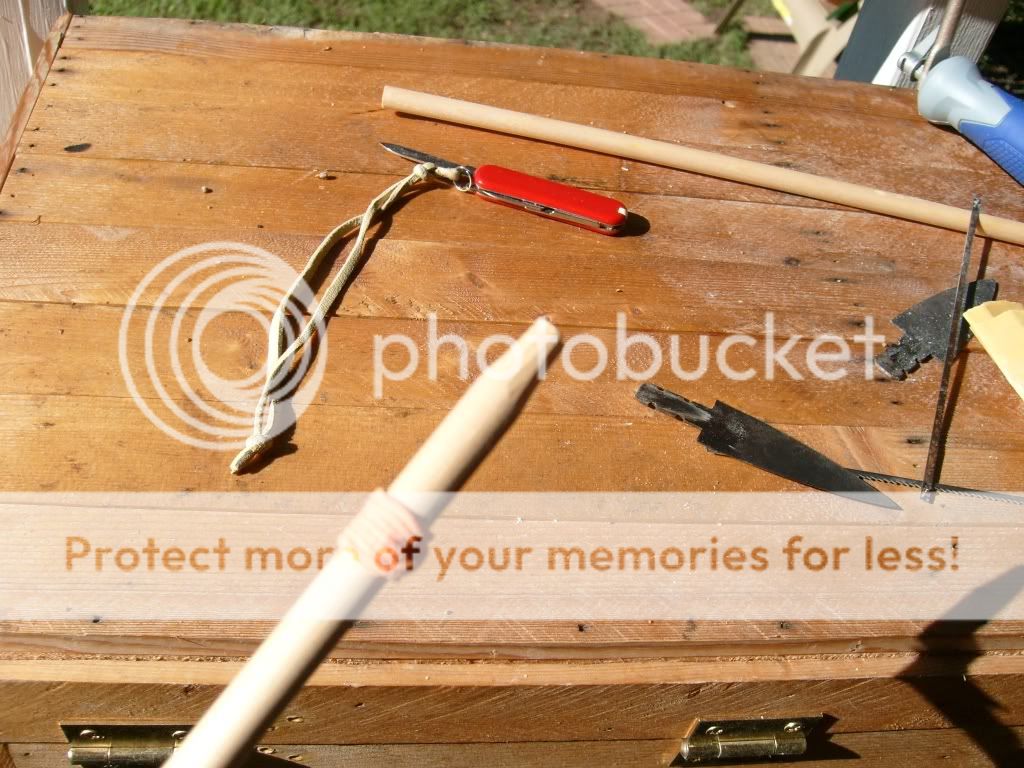 Using the blade of the knife, make a guide line parallel with the cut groove down each side of the shaft.  Laying the blade in the groove with the handle end butted against the end of the shaft and pressing will make a line exactly the length you will need to cut.  Don't press the blade too hard into the wood or it will split the shaft.  Slide the rubber band up to where it is just below the knife cuts.  Holding the saw nearly parallel with the shaft, begin saw down the guide lines.  Don't wory about sawing the groove all the way down with the xacto saw, just go down the guide lines on either side.