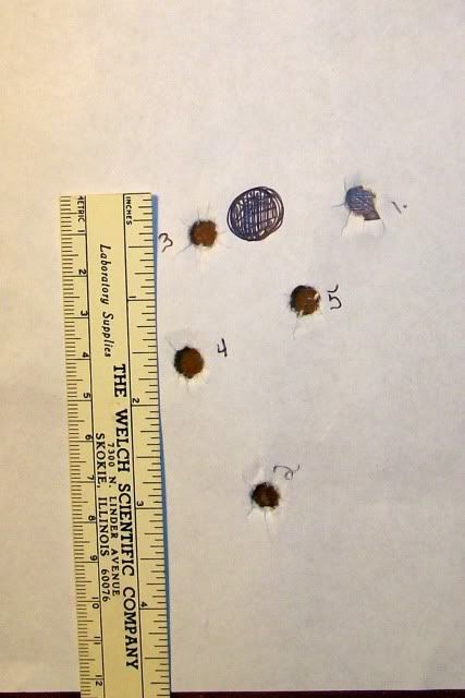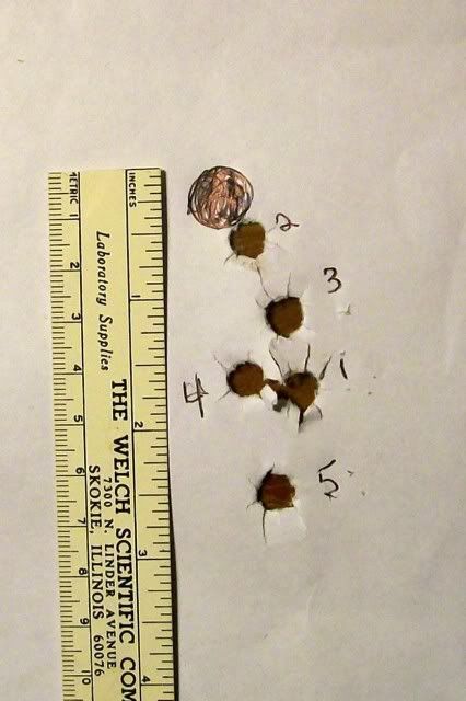 Left side shows my first five shots.  I did some measuring and shot number 2 would have been in the middle of the six ring on the dualing target,  number 4 is an 8, 1 and 5 are 9's, and 3 is in the first ring around the bullseye.