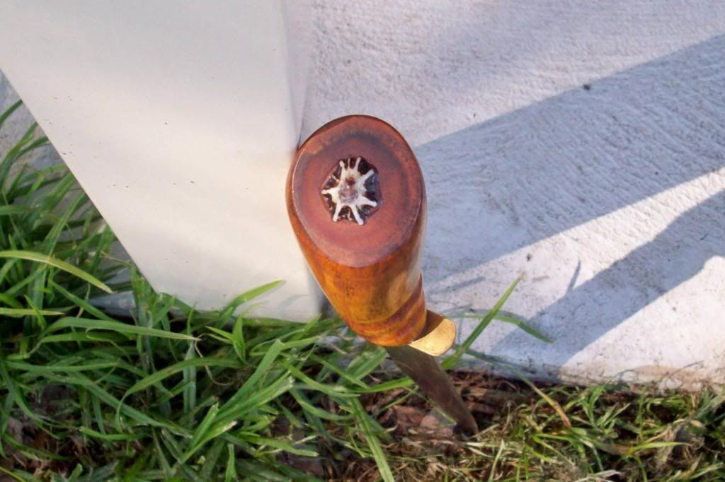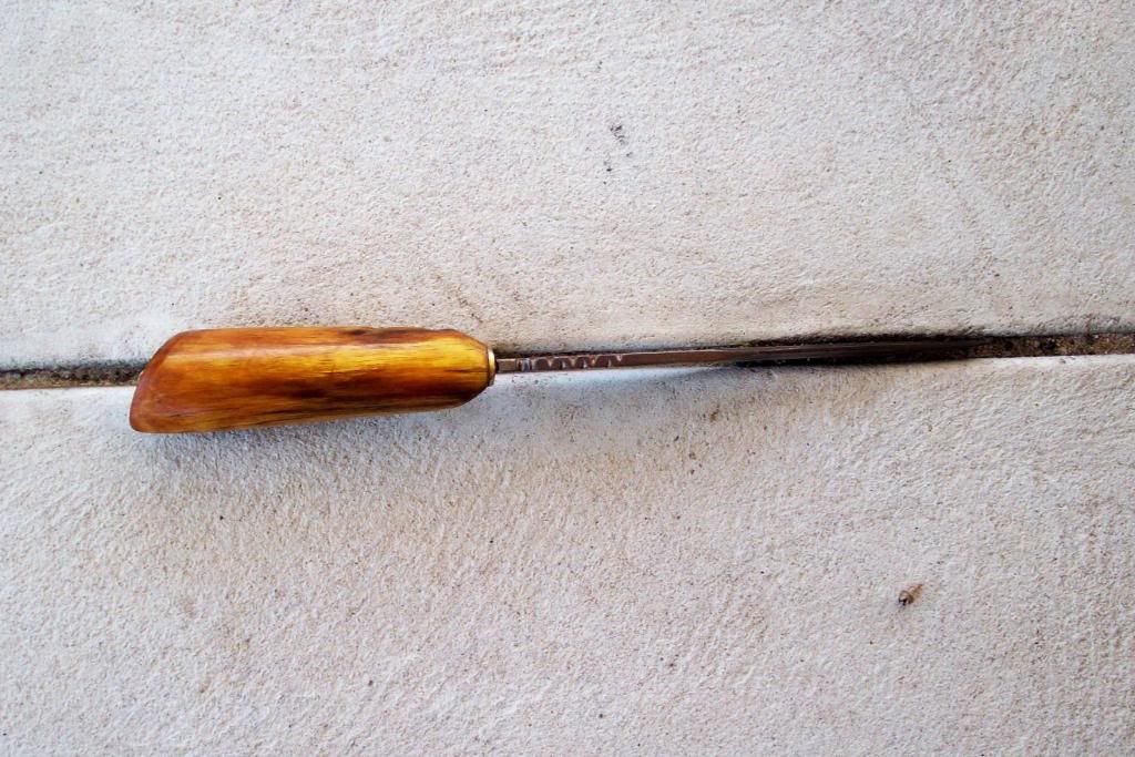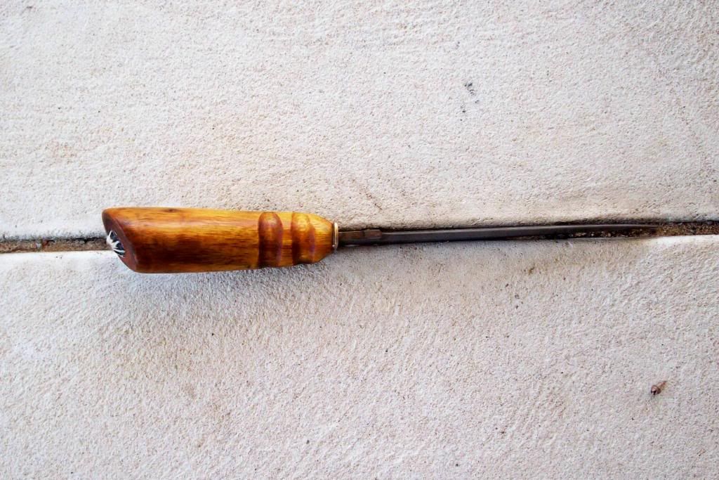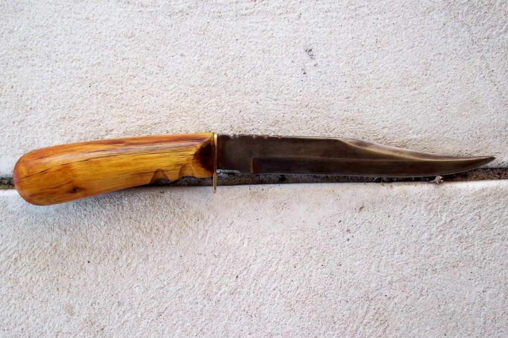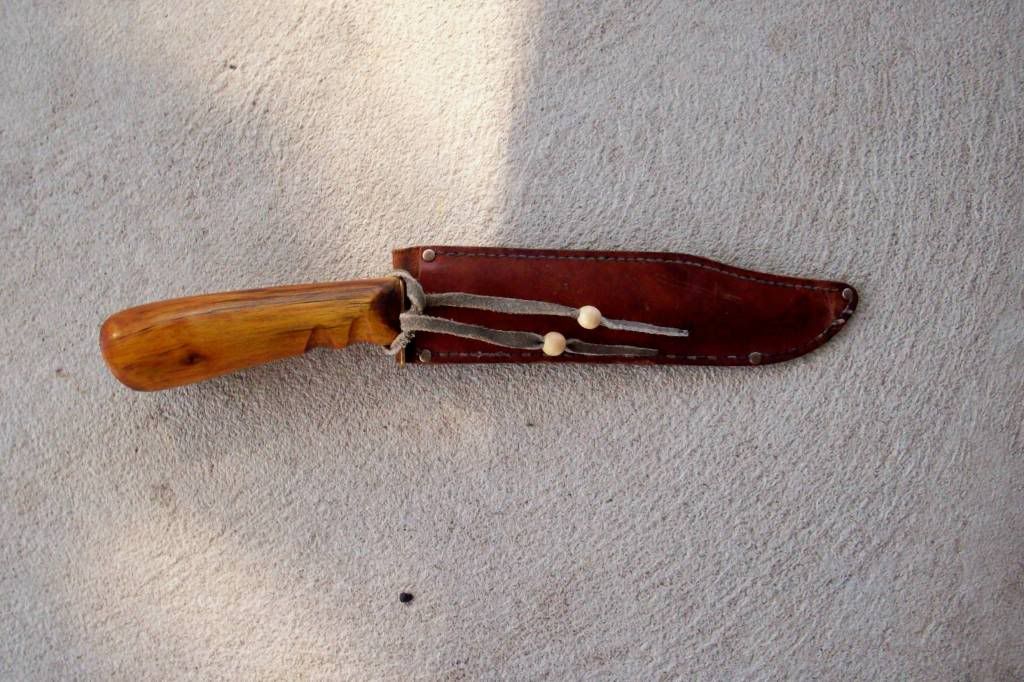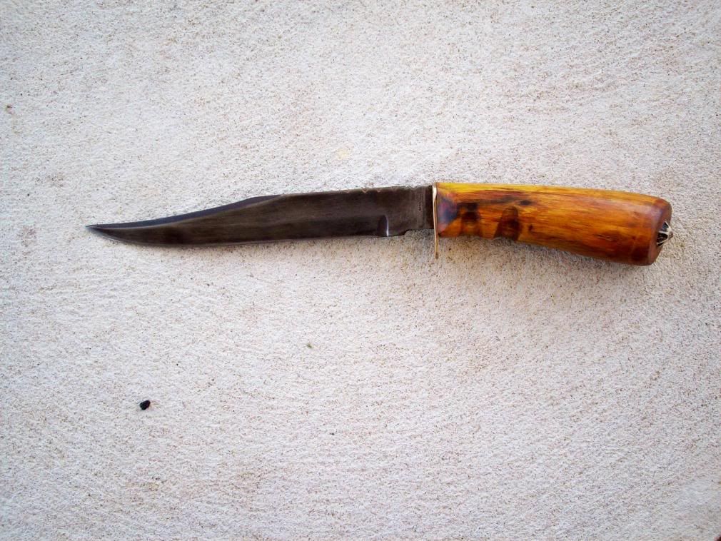 got this knife from my brother in law he had it when he was in the boy scouts he is now 66 years old he got it when he was 14 years old,it had a leather stacked handle which was beyond redemption,so i did a cape lilac handle for it its now a very good pig sticker,the blade is 8" long and gets a good edge its a japnese blade,i have not had time to make a new sheath for it yet but the origional one will do for now.