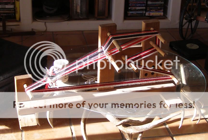 This is the Inkle loom the strap was done on. At this point it is about 2/3's strung in preperation for weaving. The empty holes are for length adjustment, by changing the position of the dowels you make the finished strap longer or shorter. This style of weaving goes back to the Middle Ages, if not further...