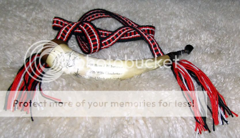 The finished product, with the exception of the brain tan tabs to suspend the horn from the strap, which need to be fitted to each individuals preference, as far as how high or low they prefer to carry the horn & will give mainiac something to do... ::)