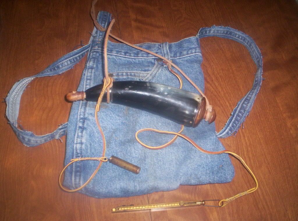 Here is a bag i made out of a pair of old blue jeans and a horn i bought at a swap meat for five dollars.